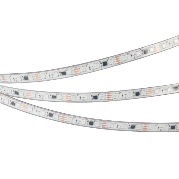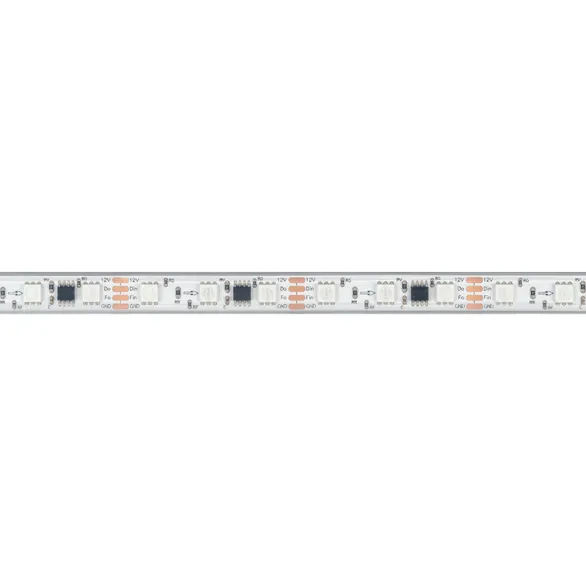 Светодиодная герметичная лента SPI серии B60 с микросхемой MT1808A, IP67 (PS - силиконовая экструзия). Светодиоды SMD 5060, 60 шт/м, 20 pixels на 1м (100 pixels на 5 м), 1 pixel = 3 светодиода, белая плата шириной 10 мм, скотч 3М. Цвет RGB, угол 120°. Питание 12 В, мощность 12 Вт/м (60 Вт на 5 м). Размеры 5000x12x5 мм. Мин. отрезок 50 мм, 3 светодиода. Цена за 1 м.