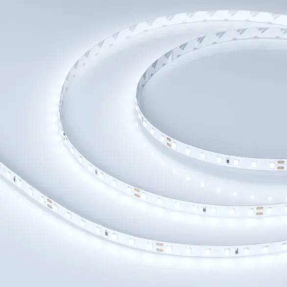 Открытая светодиодная лента шириной 8 мм и мощностью 10 Вт/м с индексом цветопередачи CRI>85. Светодиоды SMD 2835 (98 шт/м) холодного белого цвета свечения (7700–9600 К). Напряжение питания 24 В. Минимальный отрезок 71.43 мм (7 светодиодов). Высокая эффективность >125 лм/Вт. Лента применяется для декоративной подсветки интерьеров, потолочных ниш, рабочих зон кухни, мебели, а также подходит для подсветки рекламных конструкций и витрин.