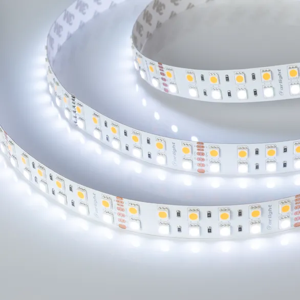 RGB+Warm мультицветная лента, 2 ряда светодиодов smd 5060, 144шт/м (720шт на 5м), белая плата 19мм, скотч 3М. Цвет Мультицвет R/G/B+Тёплый 2600-2800K. Питание 24V, мощность 160 Вт на 5м, из них R/G/B=16 Вт/м (5.3 Вт/м канал), белый W=16 Вт/м, угол 120°. Размеры 5000х19х2.2мм. Мин.отрезок 83.3мм, 12 светодиодов. Цена за 1м.