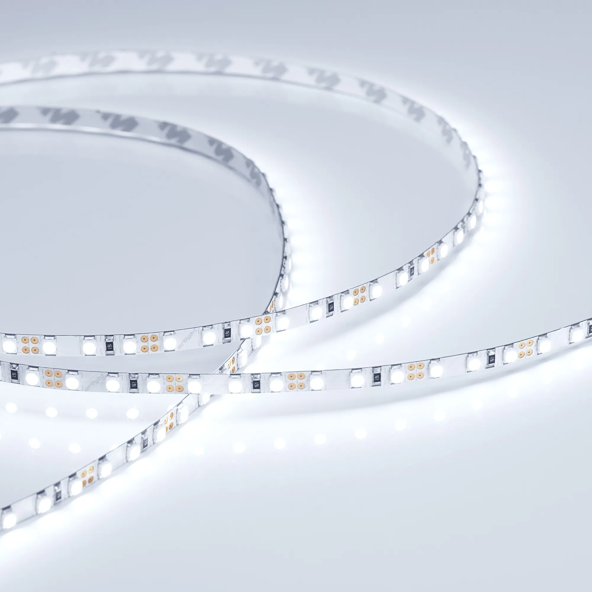 Светодиодная узкая лента RT серии A120. Светодиоды SMD 2835, 120 шт/м, белая плата шириной 5 мм, скотч 3M. Цвет ХОЛОДНЫЙ 8000K, индекс цветопередачи CRI>85, угол 120°. Питание 12 В, мощность 9.6 Вт/м (48 Вт на 5 м). Размеры 5000х5х1.5 мм. Мин. отрезок 25 мм, 3 светодиода. Цена за 1 м.