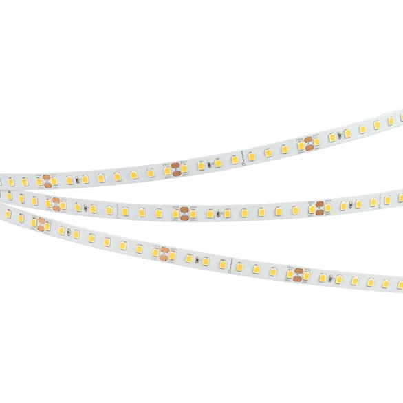 Светодиодная высокоэффективная лента RT серии A128. Светодиоды SMD 2835, 128 шт/м, белая плата шириной 8 мм, скотч 3M. Цвет ТЕПЛЫЙ 3500K, высокая световая эффективность 150 лм/Вт, индекс цветопередачи CRI>85, угол 120°. Питание 24 В, мощность 9.6 Вт/м (48 Вт на 5 м). Размеры 5000x8x1.6 мм. Мин. отрезок 62.5 мм, 8 светодиодов. Цена за 1 м.