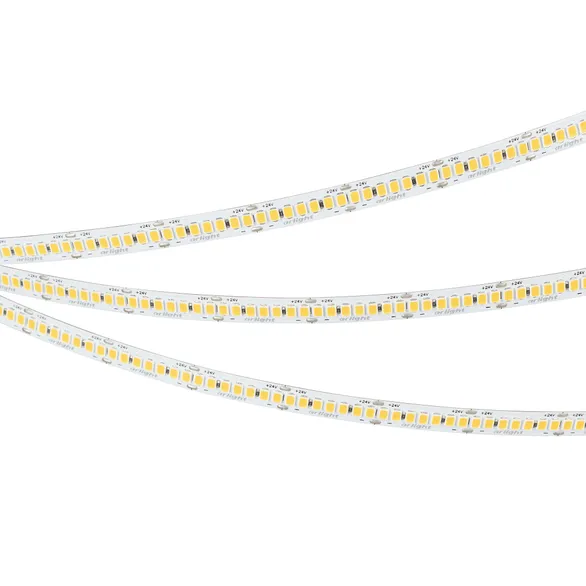 Светодиодная лента RT серии A280 шириной 8 мм, мощностью 10 Вт/м. Светодиоды SMD 2835, 280 шт/м, теплого цвета свечения (3500K). Напряжение питания 24 В. Минимальный отрезок 25 мм (7 светодиодов). Применяется для декоративной подсветки интерьеров, потолочных ниш, рабочих зон кухни, мебели. Высокая плотность светодиодов позволяет избегать световых точек при установке в профиле небольшой глубины с матовым экраном. Подсветка рекламных конструкций и витрин.