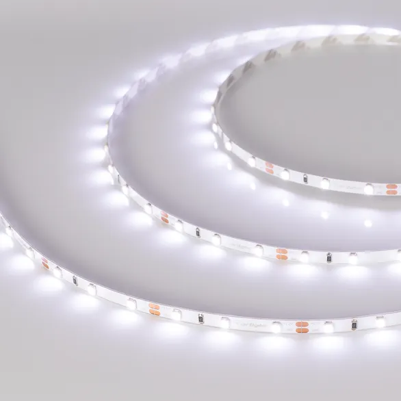 Узкая светодиодная лента RT серии A60 шириной 5 мм, мощностью 4.8 Вт/м. Цвет свечения холодный (15000K, белый с синим оттенком). Напряжение питания 12 В. Светодиоды 2835, 60 шт/м. Минимальный отрезок 50 мм (3 светодиода). Индекс цветопередачи CRI>85. Универсальная лента для организации декоративной подсветки в помещениях: подсветка лестниц, ступеней, плинтусов, ниш, мебельных полок, натяжных потолков и витражей. Узкая плата позволяет установить ленту в тонкий паз. Управление с помощью диммера для одноцветных лент.