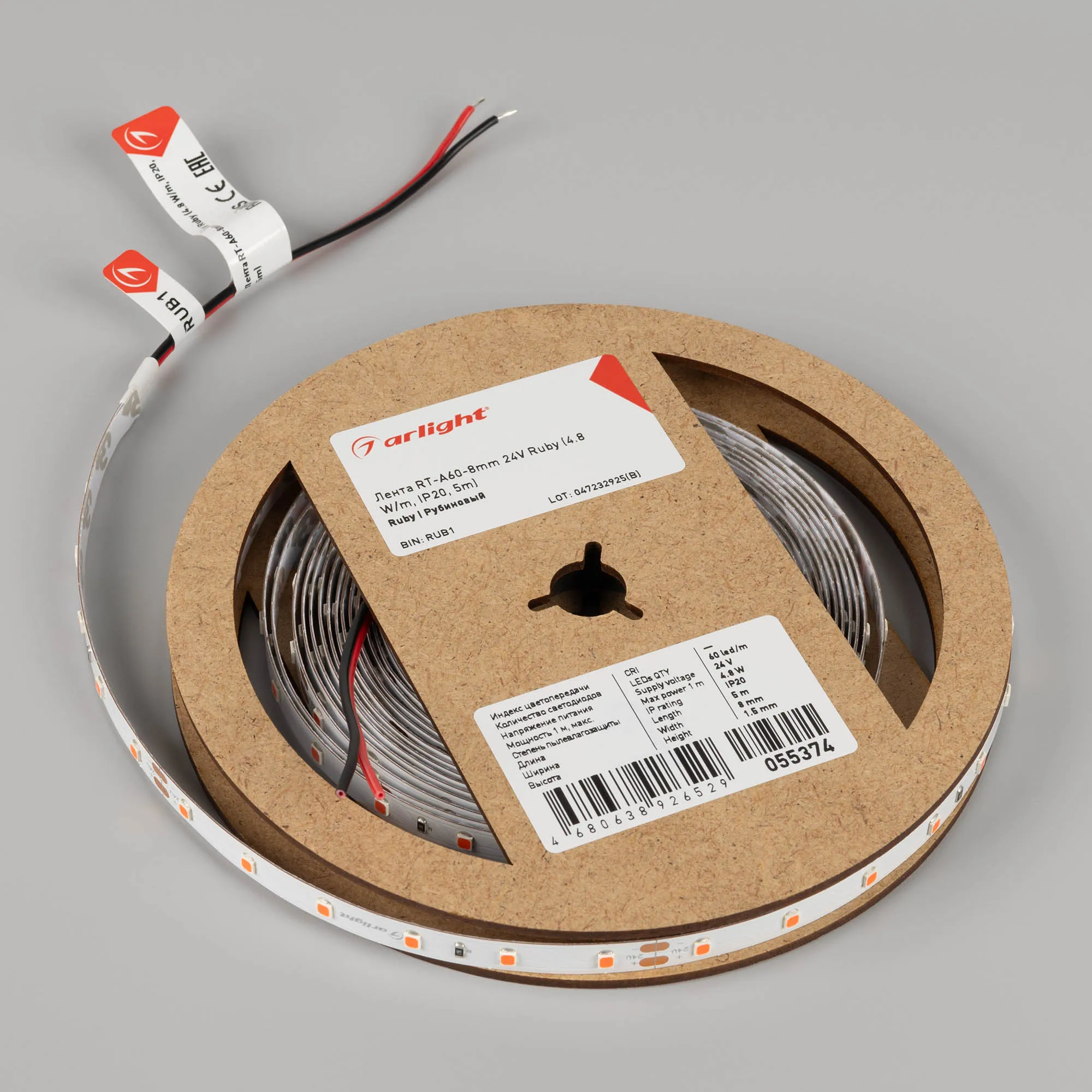 Светодиодная лента RT серии A60. Светодиоды SMD 2835, 60 шт/м, белая плата шириной 8 мм, скотч 3M. Цвет РУБИНОВЫЙ, угол 120°. Питание 24 В, мощность 4.8 Вт/м (24 Вт на 5 м). Размеры 5000x8x1.5 мм. Мин. отрезок 100 мм, 6 светодиодов. Цена за 1 м. Рекомендуется установка на профиль.