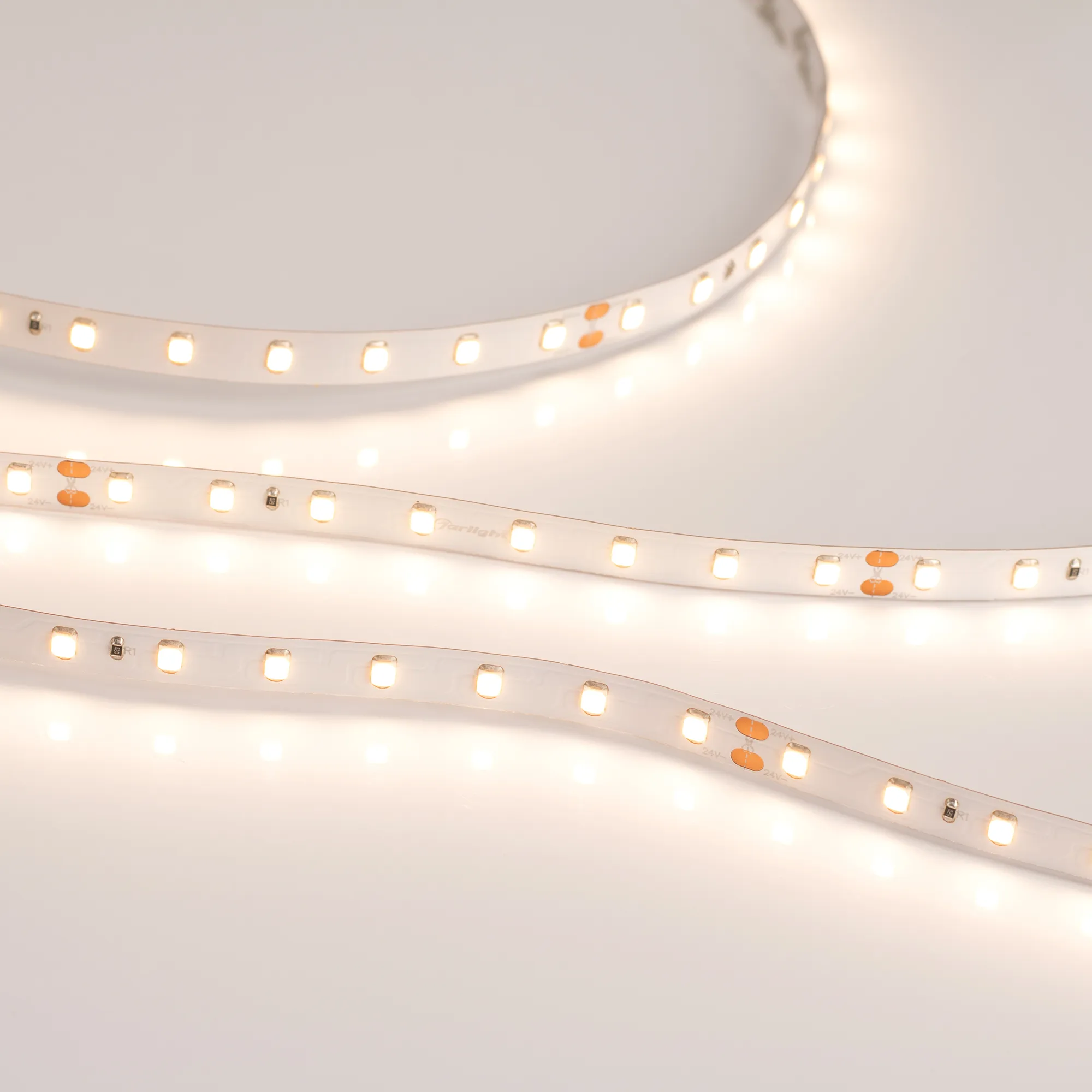 Светодиодная высокоэффективная лента RT серии A80 (монтажная бобина 50 м). Светодиоды SMD 2835, 80 шт/м, белая плата шириной 8 мм, скотч 3M. Цвет ТЕПЛЫЙ 2700K, высокая световая эффективность 150 лм/Вт, индекс цветопередачи CRI>85, угол 120°. Питание 24 В, мощность 6 Вт/м (300 Вт на 50 м). Размеры 50000x8x1.5 мм. Мин. отрезок 100 мм, 8 светодиодов. Цена за 1 м. Разрезать перед подключением. Макс. длина подключения 5 м.