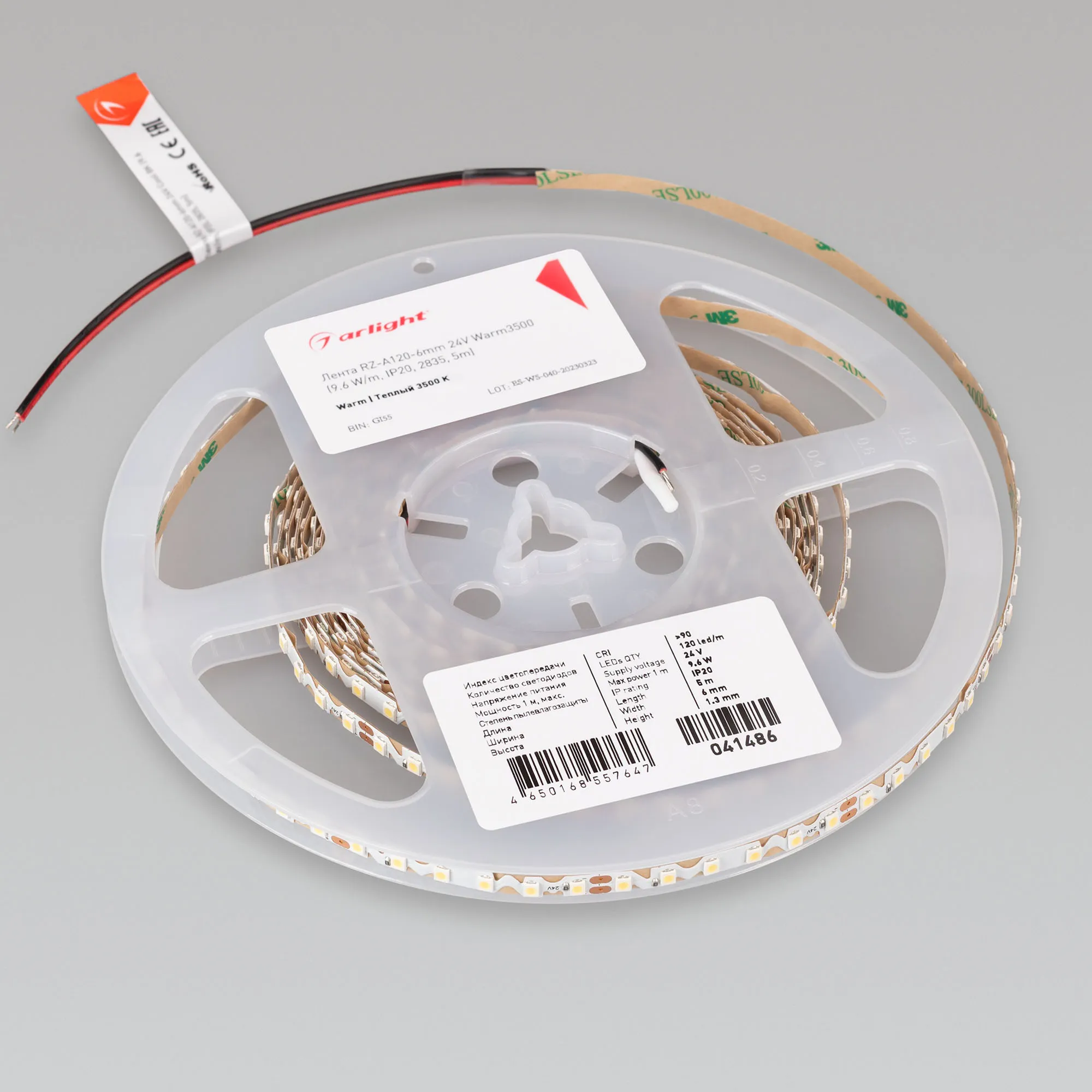 Светодиодная лента RZ серии A120 шириной 6 мм, мощностью 9.6 Вт/м, со специальной формой платы в виде волны позволяет изгибать ленту на плоскости. Максимальный радиус изгиба на плоскости 30 мм. Вертикальный радиус изгиба 30 мм. Напряжение питания 24 В. Светодиоды SMD 2835 (120 шт/м) теплого свечения (3500K). Высокий индекс цветопередачи CRI>90. Минимальный отрезок 50 мм (6 светодиодов). Подходит для установки в криволинейные пазы. Подсветка букв, ниш, витрин, вывесок, криволинейных форм. Обязательна установка на профиль.