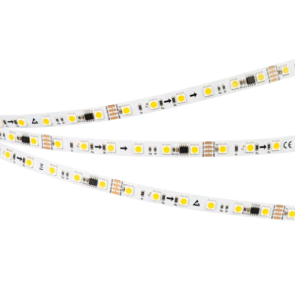 Светодиодная лента SPI серии B60 с микросхемой GS8206. Светодиоды SMD 5060, 60 шт/м, 10 pixels на 1 м (50 pixels на 5 м), 1 pixel = 6 светодиодов, белая плата шириной 10 мм, скотч 3М. Цвет ТЕПЛЫЙ 3000K, индекс цветопередачи CRI>80, угол 120°. Питание 24 В, мощность 15 Вт/м (75 Вт на 5 м). Размеры 5000x10x2.1 мм. Мин. отрезок 100 мм, 6 светодиодов. Цена за 1 м.