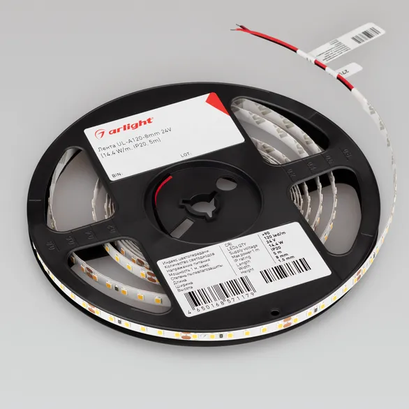 Универсальная светодиодная лента UL серии A120 шириной 8 мм, мощностью 9.6 Вт/м, с гарантией 7 лет. Напряжение питания 24 В. Светодиоды SMD 2835, 120 шт/м, дневного цвета свечения (5000K). Высокий индекс цветопередачи CRI>90 обеспечивает точное восприятие цветовых оттенков при освещении любых помещений. Минимальный отрезок 50 мм (6 светодиодов). Применяется для декоративной подсветки любых жилых, коммерческих помещений, декоративной подсветки интерьеров, потолочных ниш, рабочих зон кухни, мебели, рекламных конструкций и витрин. Рекомендуется установка на профиль.