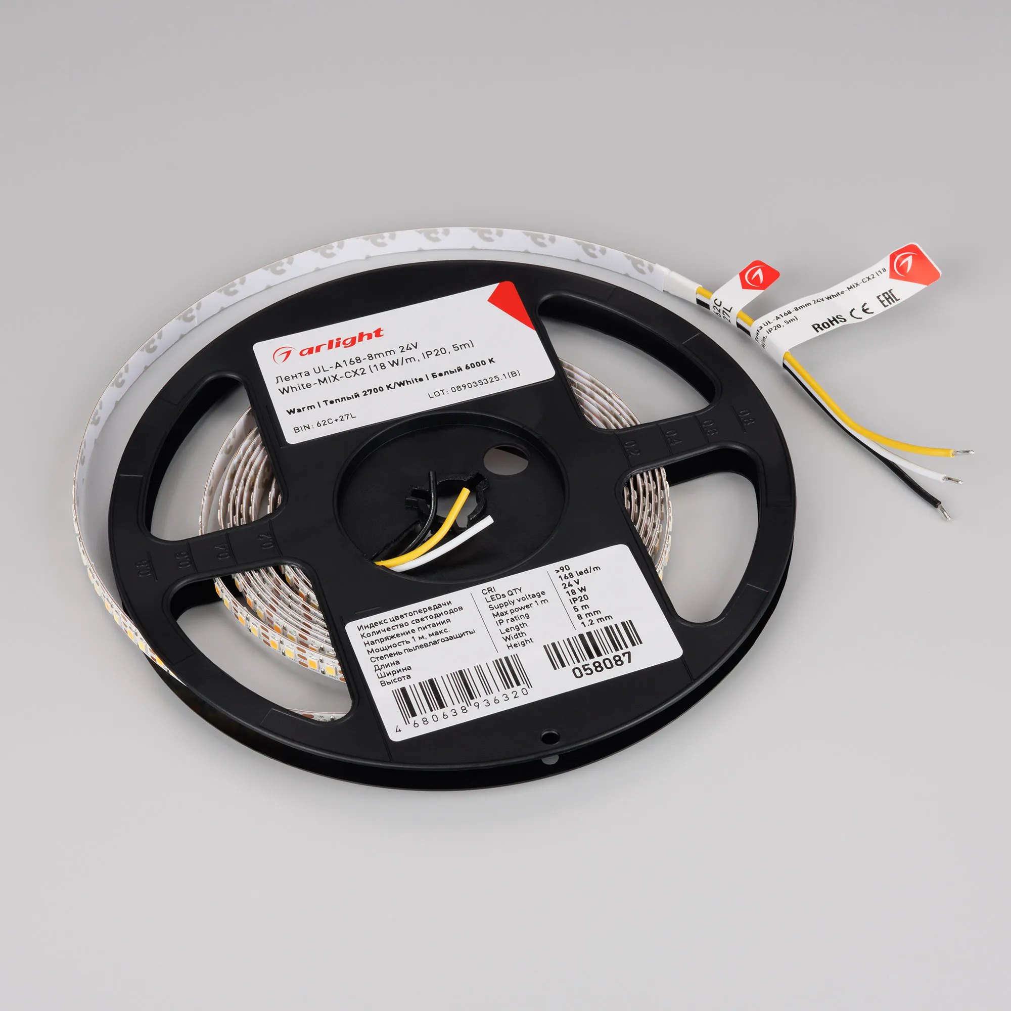 Светодиодная лента UL серии A168, шириной 8 мм, мощностью 18 Вт/м, с изменяемым цветом свечения (MIX) в диапазоне от белого (6000K) до теплого (2700K). Напряжение питания 24 В. Светодиоды SMD 2835, 168 шт/м. Высокий индекс цветопередачи CRI>90, обеспечивающий точное восприятие цветов при освещении любых жилых и коммерческих помещений. Минимальный отрезок 11.9 мм (2 светодиода). Двухканальная лента с тремя проводами для подключения, управляется MIX-контроллером. Применяется для создания биодинамического освещения, декоративной подсветки элементов интерьера, мебели. Обязательна установка на профиль.