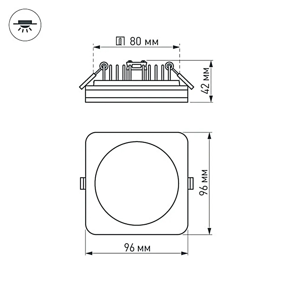 Встраиваемый квадратный светодиодный светильник LTD-96×96SOL-BK-10W Day White мощностью 10 Вт с дневным белым цветом свечения (4000 К) и светящимся контуром для создания основного и декоративного освещения. Оригинальный дизайн корпуса с декоративной вставкой из акрила дополнит любой интерьер. Тонкий корпус светильника со степенью пылевлагозащиты IP44 и компактный драйвер, поставляемый в комплекте, позволяют встраивать светильник в натяжные и гипсокартонные потолки. У светильника 2 типа освещения: боковое с углом излучения 120° и основное с углом излучения 180°. Индекс цветопередачи CRI>80, световой поток 700 лм и матовый рассеиватель обеспечивают мягкий равномерный свет. Светильник легко устанавливается с помощью пружин в монтажное отверстие размером 80×80 мм и минимальной высотой 40 мм.