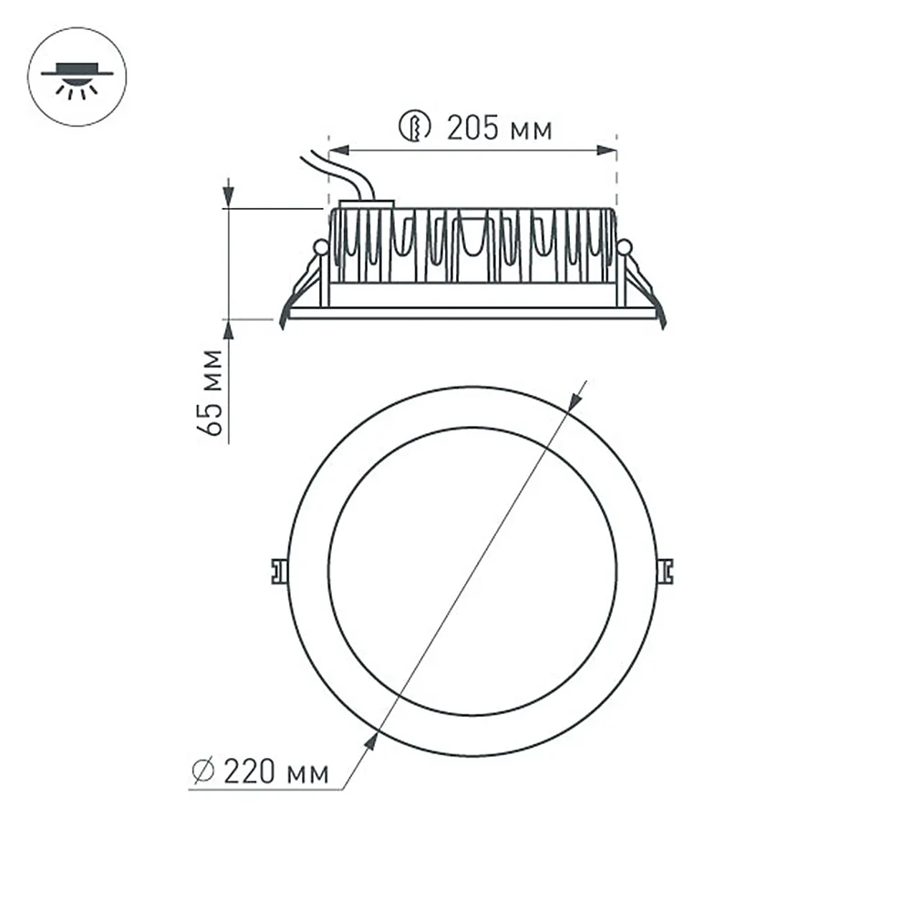 Встраиваемый круглый светильник, угол 110° / 30Вт / ДНЕВНОЙ БЕЛЫЙ 4000K / светодиод 1x30W / 3120 лм, CRI>80. Белая лицевая панель. IP44. Питание AC180-240V, 30Вт, 700mA 39-47V, драйвер в комплекте. Размеры DxH: 220х65мм, отверстие для установки 205мм.