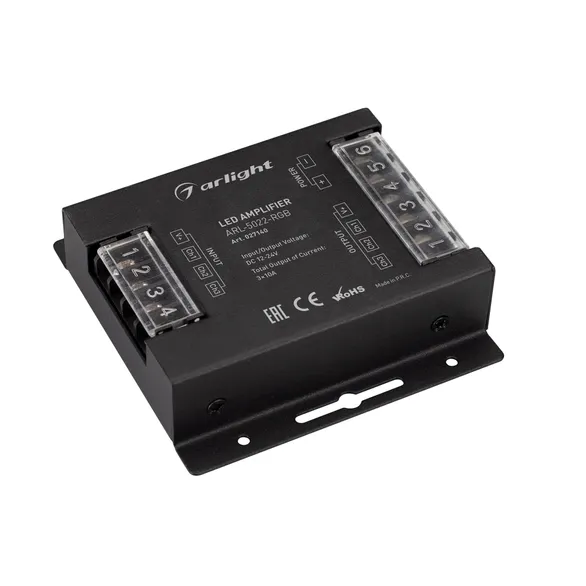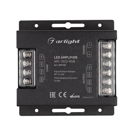 3-канальный силитель, предназначенный для увеличения мощности и подключения большего количества мультицветных RGB светодиодных лент. Питание изделия имеет диапазон напряжений от 12В до 24В, максимальный ток 10А на 1 канал, максимальная мощность 360-720Вт (в зависимости от напряжения питания). Усилитель имеет металлический корпус черного цвета. Это позволяет лучше отводить тепло и увеличивает срок службы изделия. Габариты усилителя составляют 91x88x24мм.